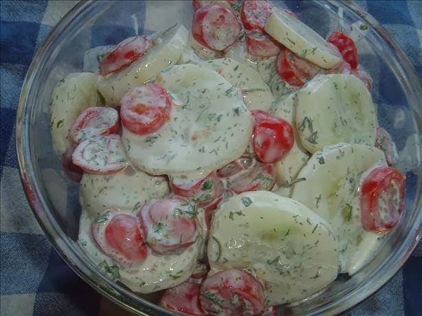 Place the cucumbers, onions and tomatoes in a large bowl. Set aside.